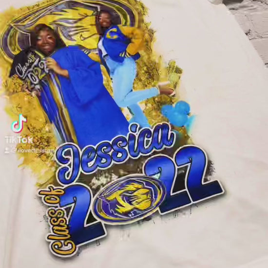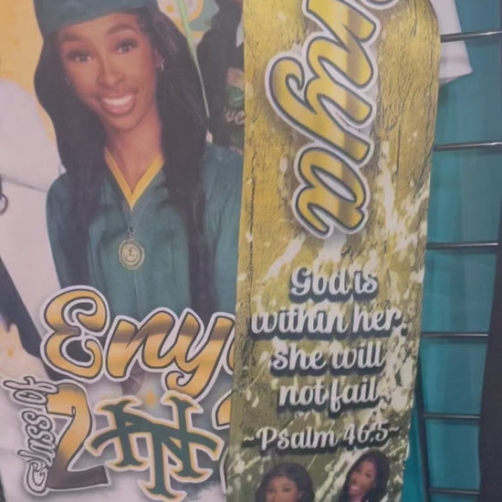 This custom graduation stole is the perfect keepsake for your graduate. It will be personalized with your name, 2-4 pictures, your logo or mascot, and the theme colors.